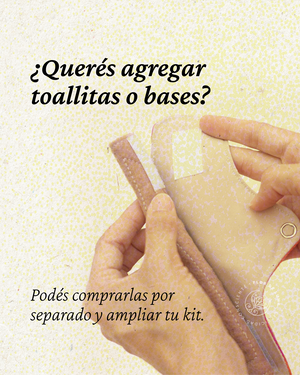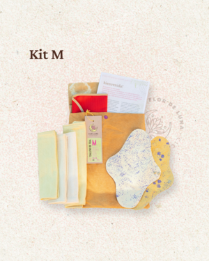 El Kit M contiene: 3 toallitas M (diurnas), 1 toallita G (nocturna), 2 bases impermeables P, 1 poster con mucha información sobre el ciclo y sobre el uso de las toallitas, 1 sobre de tela impermeable para llevar un cambio en la cartera y 1 bolsa de tela de mano.